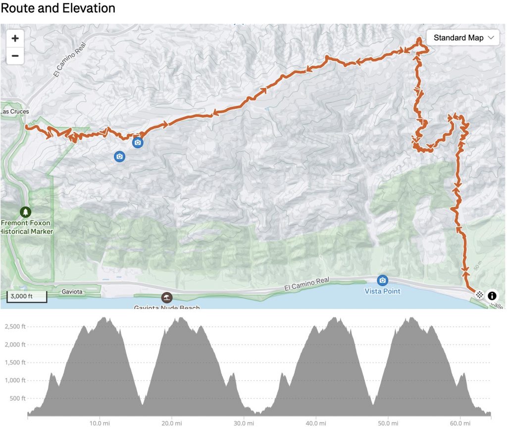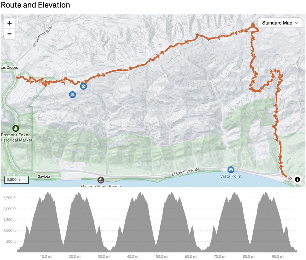 100 : Distance (mi) • 24,059 : Elevation Gain (ft) • 59 : Lowest Point (ft) • 2769 : Highest Point (ft) • Right click and “Save as” to Download GPX file
